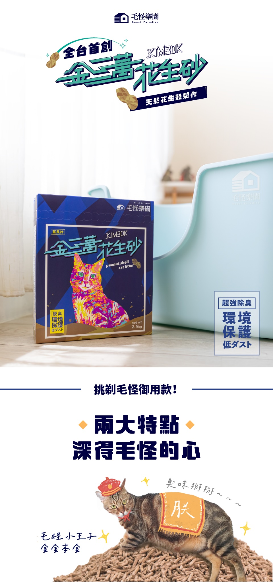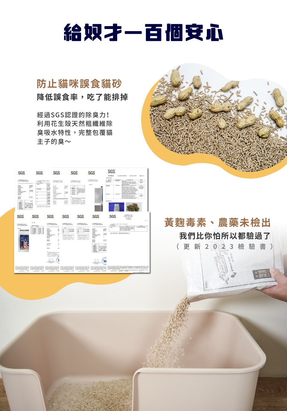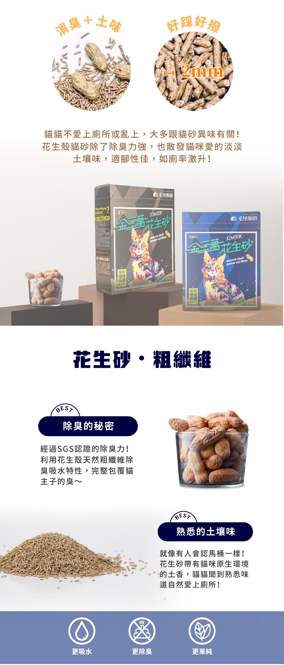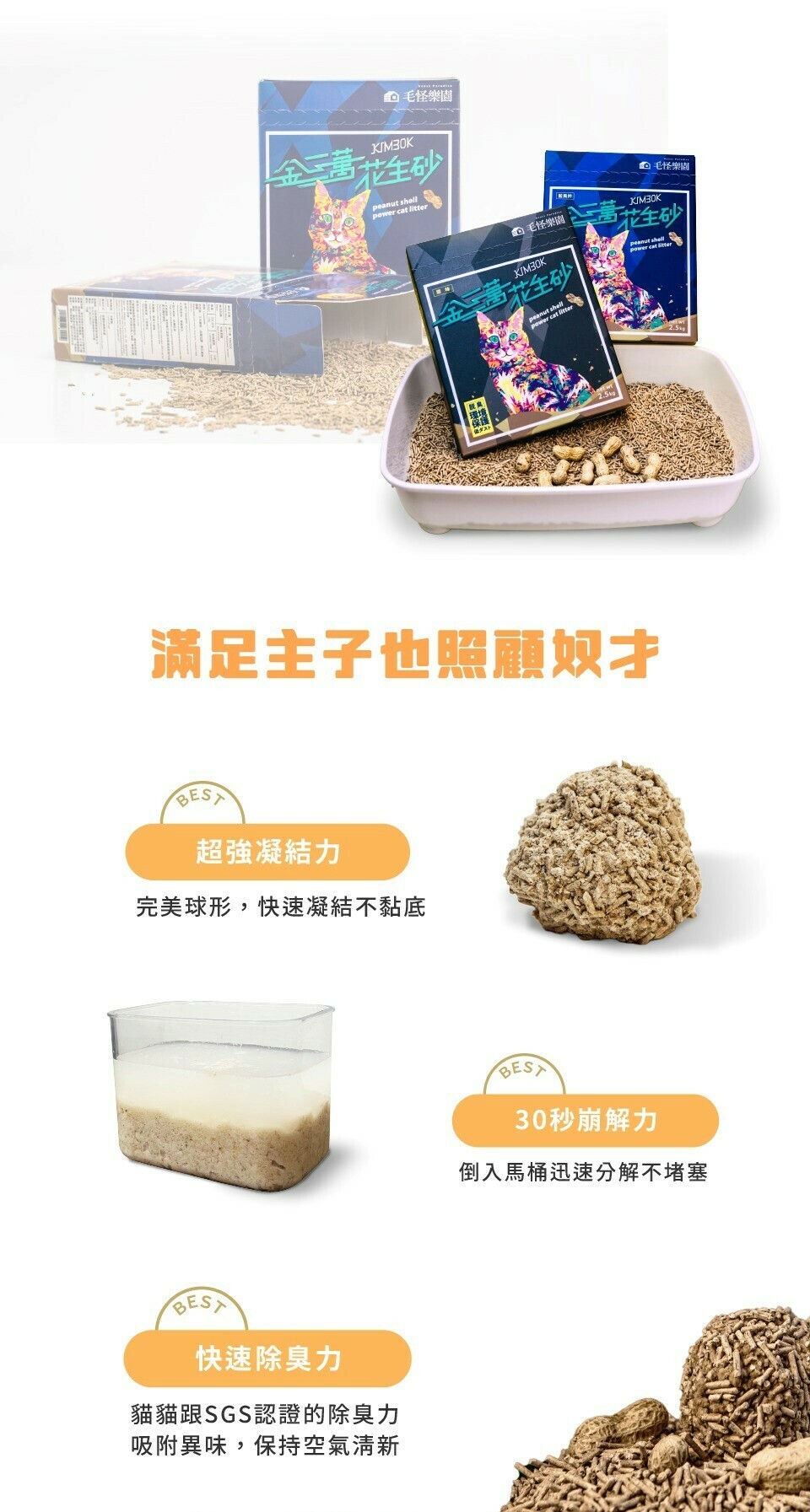 全台首創「金三萬花生砂」,採用天然花生殼粗纖維製作,除臭力通過SGS檢驗,吸水快、凝結強、近乎0粉塵,連挑剔貓主子都秒上廁所!熟悉的土味香氣+30秒崩解不堵馬桶,環保又安心。花生殼本身自帶消臭屬性,實測使用一個月僅加砂,室內依舊無味清新。