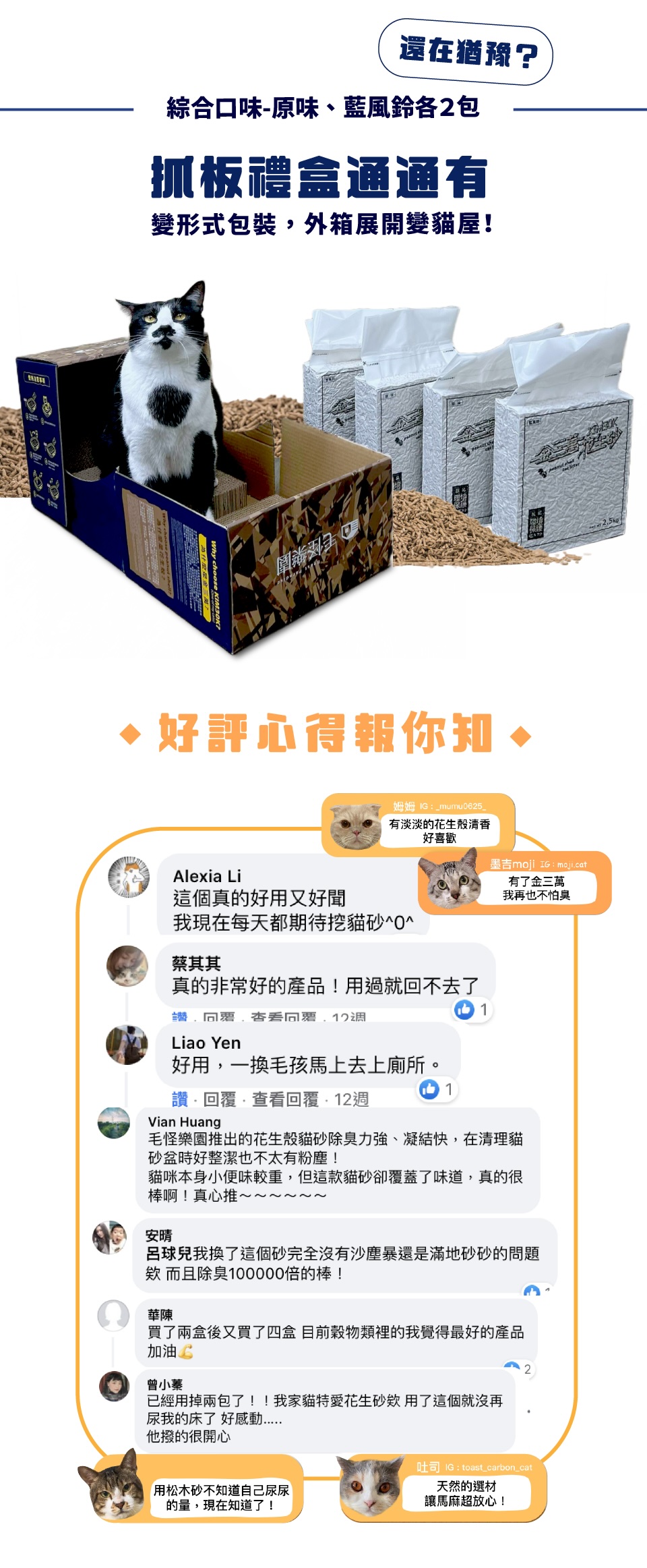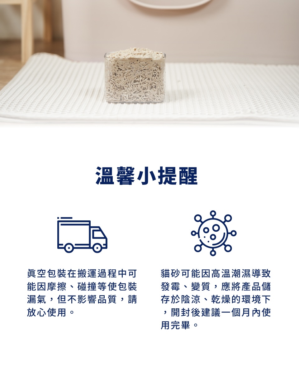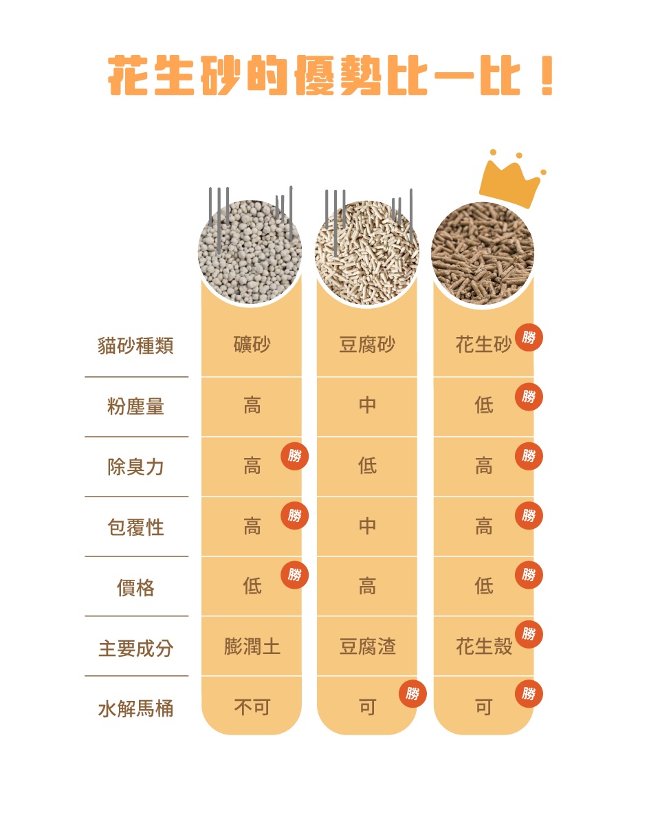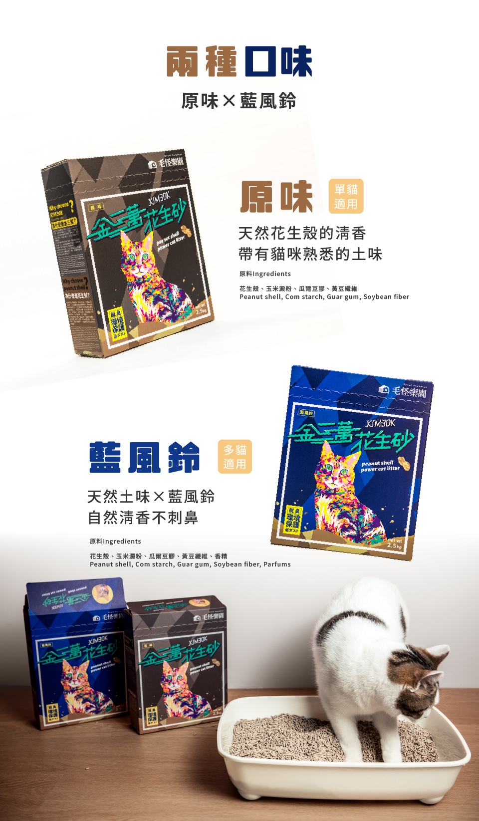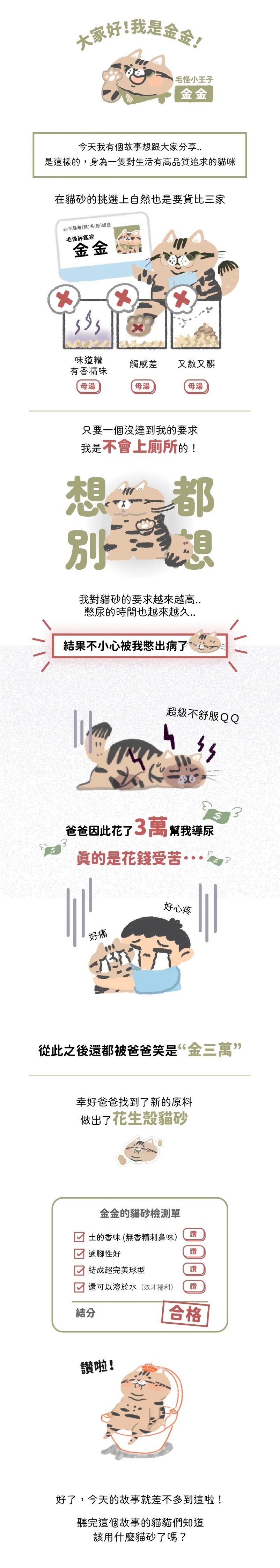 全台首創「金三萬花生砂」,採用天然花生殼粗纖維製作,除臭力通過SGS檢驗,吸水快、凝結強、近乎0粉塵,連挑剔貓主子都秒上廁所!熟悉的土味香氣+30秒崩解不堵馬桶,環保又安心。花生殼本身自帶消臭屬性,實測使用一個月僅加砂,室內依舊無味清新。