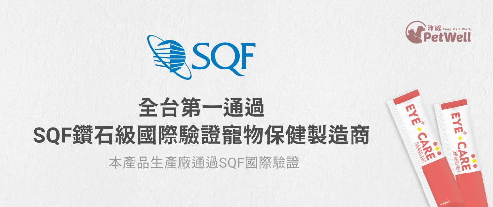 根據SQFI官方網站的供應商目錄,至2022年四月底,台灣只有味全,泰山,佳格,金車等22間廠商通過了SQF Quality Audit Edition 9 (SQF品質檢驗第九版)。其中在Pet Food Manufacturing寵物食品製造類別,PetWell沛威是第一家也是唯一一家取得認證的寵物保健食品製造商,並且拿下的是最高的Level3級別。