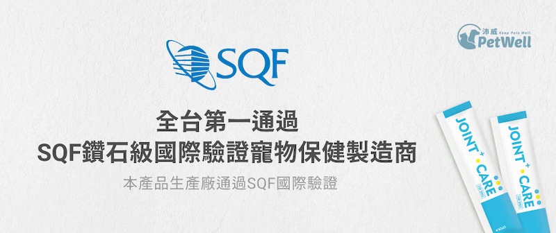 根據SQFI官方網站的供應商目錄,至2022年四月底,台灣只有味全,泰山,佳格,金車等22間廠商通過了SQF Quality Audit Edition 9 (SQF品質檢驗第九版)。其中在Pet Food Manufacturing寵物食品製造類別,PetWell沛威是第一家也是唯一一家取得認證的寵物保健食品製造商,並且拿下的是最高的Level3級別。