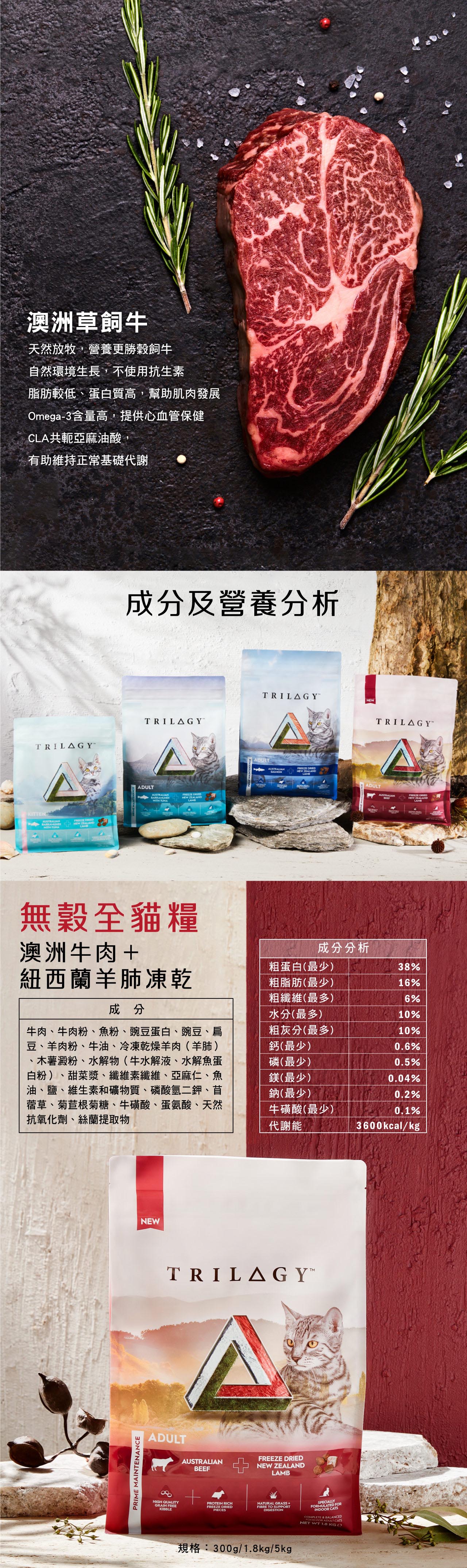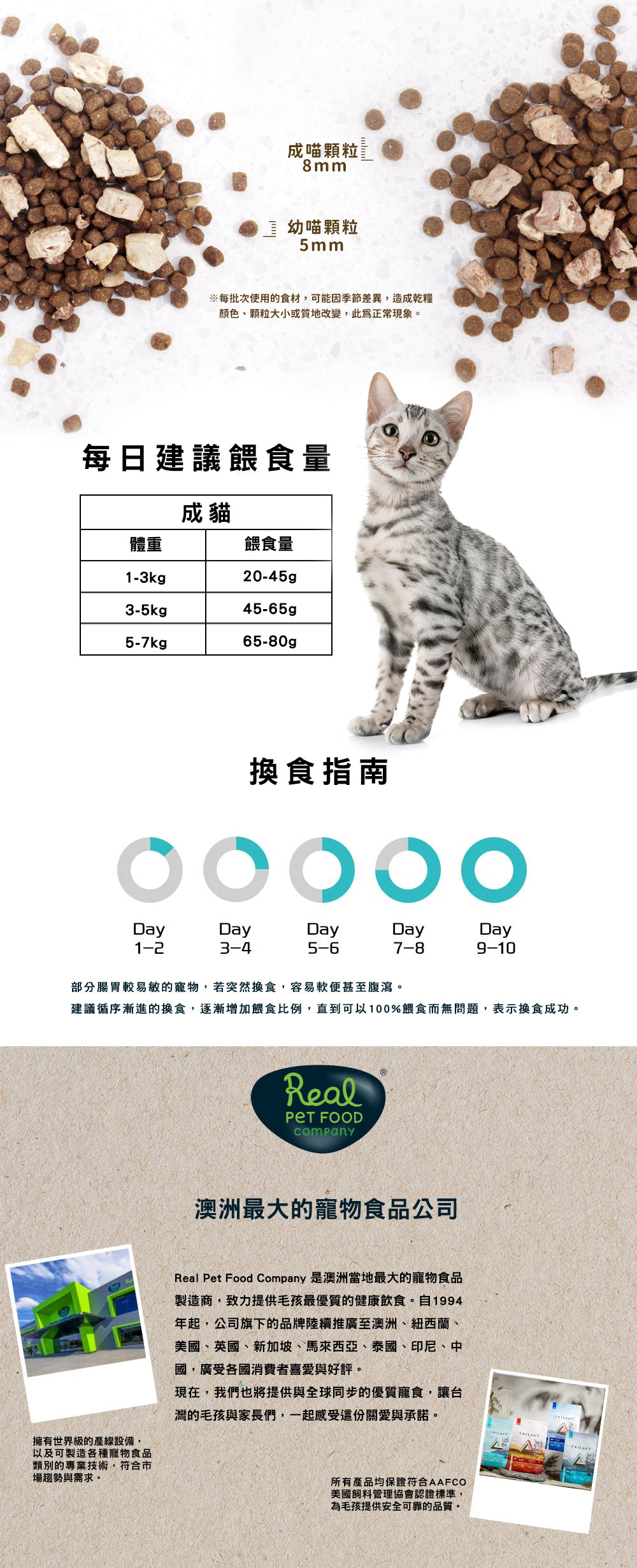 粗蛋白最少 38%、粗脂肪最少 16%、粗纖維最多 6%、水分最多 10%、粗灰分最多 10%、鈣最少 0.6%、磷最少 0.5%、鎂最少 0.04%、鈉最少 0.2%、牛磺酸最少 0.1%